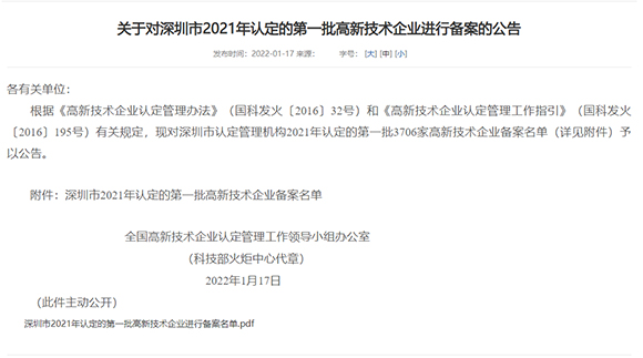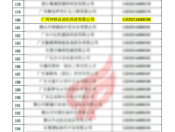 2022年1月17日,全国高新技术企业认定管理工作领导小组办公室 正式发函,根据《高新技术企业认定管理办法》(国科发火〔2016〕32号)和《高新技术企业认定管理工作指引》(国科发火〔2016〕195号)有关规定,现对广东省认定管理机构2021年认定的第一批2908家高新技术企业备案名单(详见附件)予以公告,“广州坤林自动化科技有限公司”成功入选,标志着"广州坤林科技"在研发和创新方面得到了国家相关部分的肯定和认可。
